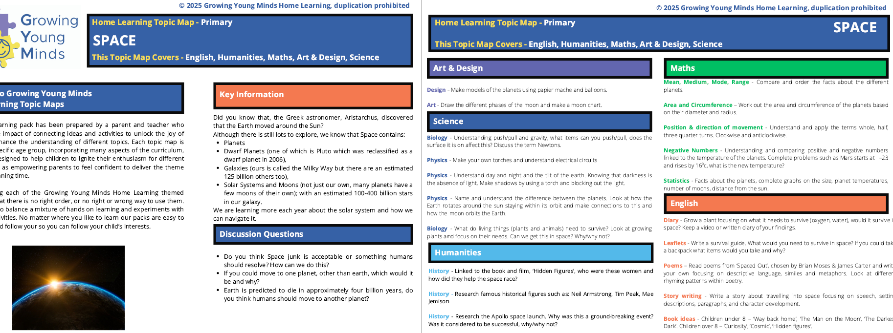 In 2019, I started Growing Young Minds Home Learning. These were fun learning packs designed to help home education families connect ideas together through one theme.